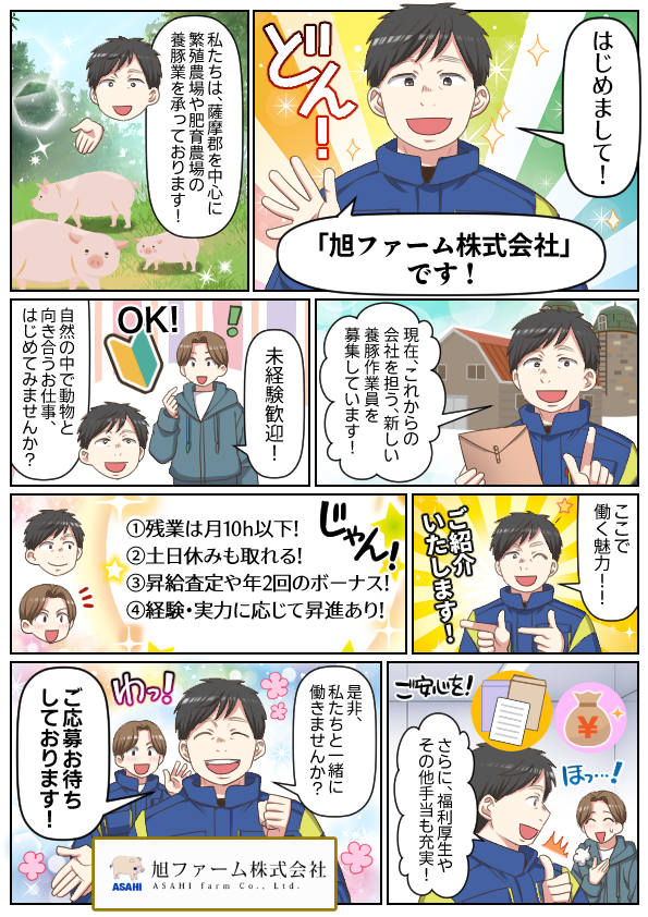 | 仕事内容 | ●人工授精 ●子豚の管理 ●お母さん豚の管理・掃除 ●洗浄・治療 など ②肥育農場 ●出荷作業 ●体重測定 ●移動 ●重機による作業 など ※配属の農場に応じて変わります。 薩摩町内3ヶ所、薩摩川内市内2ヶ所の農場があります。 |